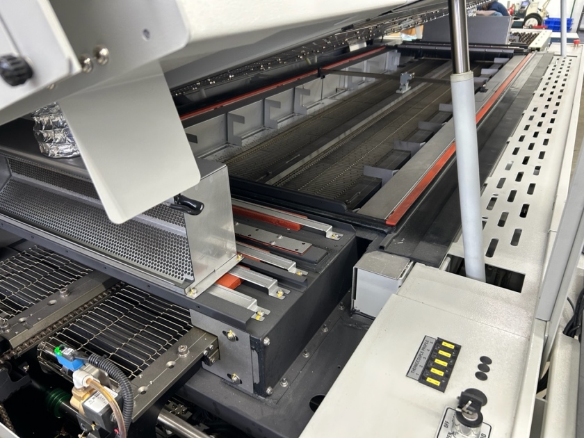 Edge Hold Conveyor (Computer Adjust) with 4.8mm / .187” long EHC Pins with Heavy Duty Overhead Trolley Center Tack System,